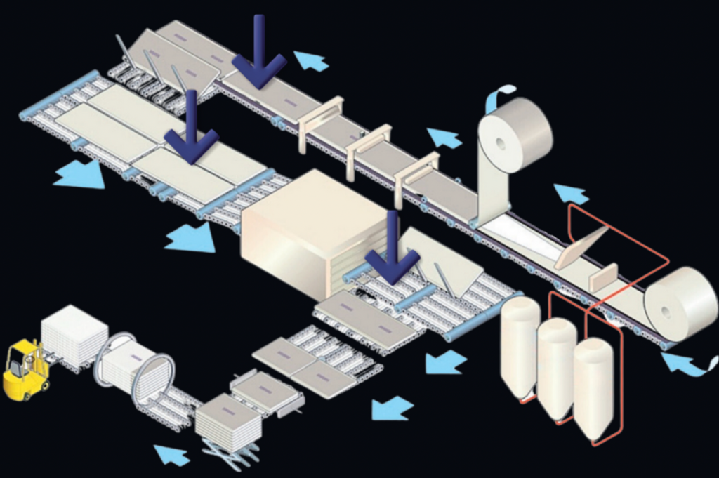 In gypsum manufacturing, defects like divots, holes, water and oil marks, wax spots, stucco marks, and burn marks often create visible contrast on the product surface. Detecting these issues accurately — especially on large, fast-moving products — requires a specialized approach.